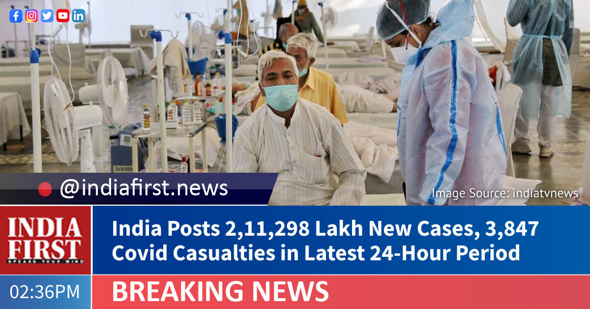 India has reported 2,11,298 fresh cases as 3,847 more patients succumbed to the coronavirus in the last 24 hours, Union Health and Family Welfare Ministry said.