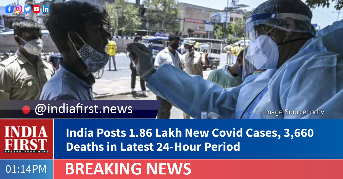 India has reported 1,86,364 fresh Covid-19 cases while 3,660 patients succumbed to the coronavirus in the last 24 hours, the Union Health and Family Welfare Ministry said.