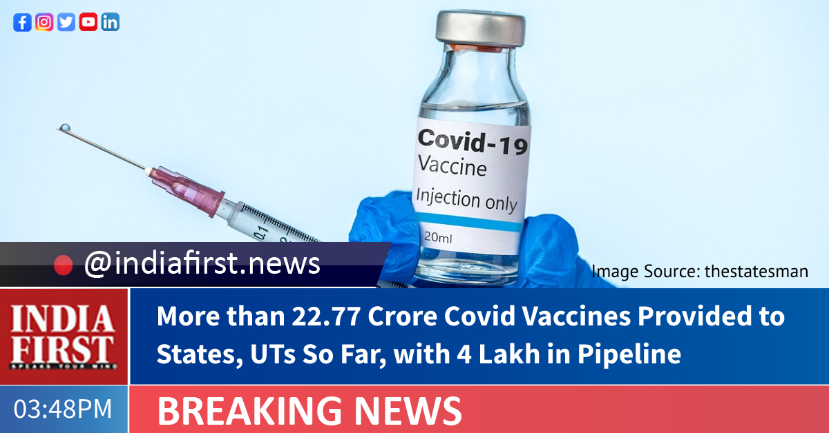 The Centre has so far provided 22,77,62,450 Covid-19 vaccine doses to States and Union Territories (UTs), and 4,86,180 doses are still in the pipeline and will be received by them within next three days.