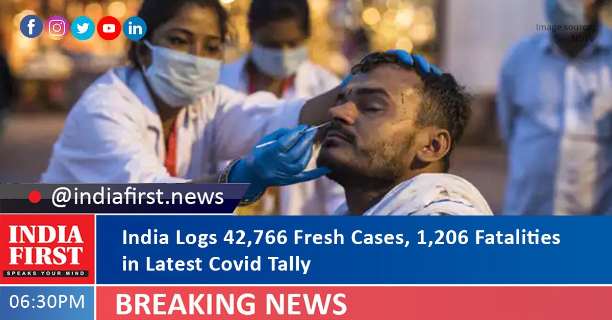 India recorded 42,766 new Covid-19 cases in the past 24 hours and 1,206 deaths, said the Union Health and Family Welfare Ministry today.