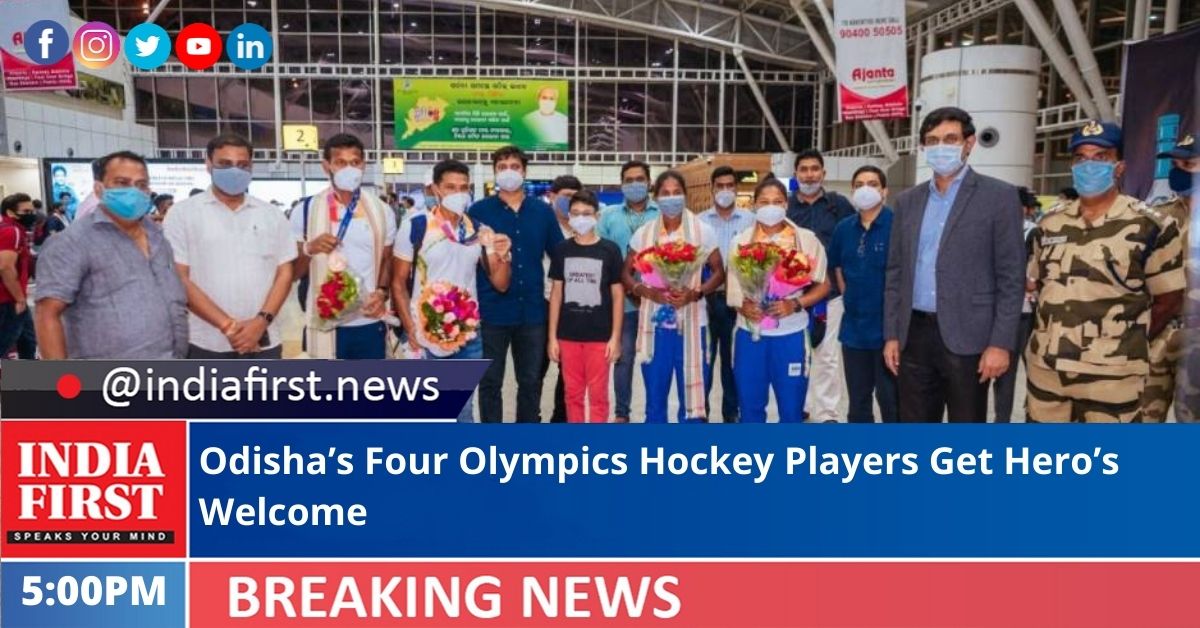 Following the Indian hockey teams’ outstanding performance at the Tokyo Olympics, a grand welcome was given to four hockey players from Odisha at the airport in Bhubaneswar last night.