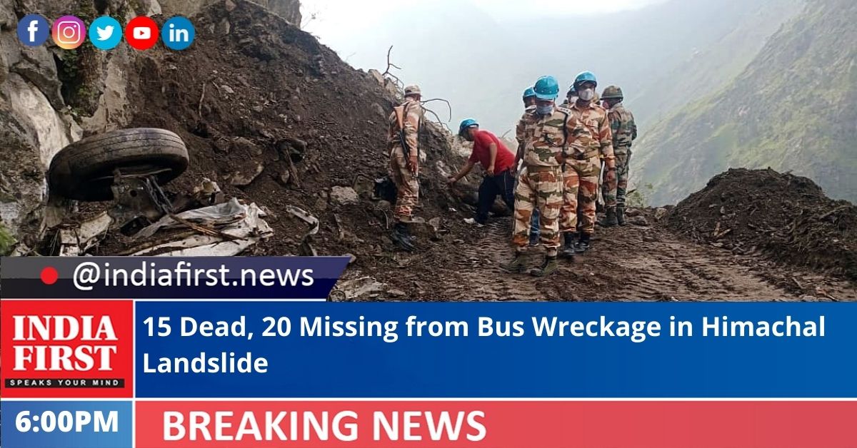 The wreckage of the bus that fell into a 500-metre-deep gorge in Himachal Pradesh’s Kinnaur district following a massive landslide was recovered today morning, rescuers said. Fifteen people lost their lives so far, while 20 others were still missing.