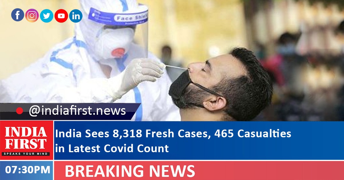 India recorded 8,318 new Covid-19 cases in the past 24 hours, taking the country’s total caseload since the pandemic began to 3,45,63,749, according to health ministry data updated today morning.