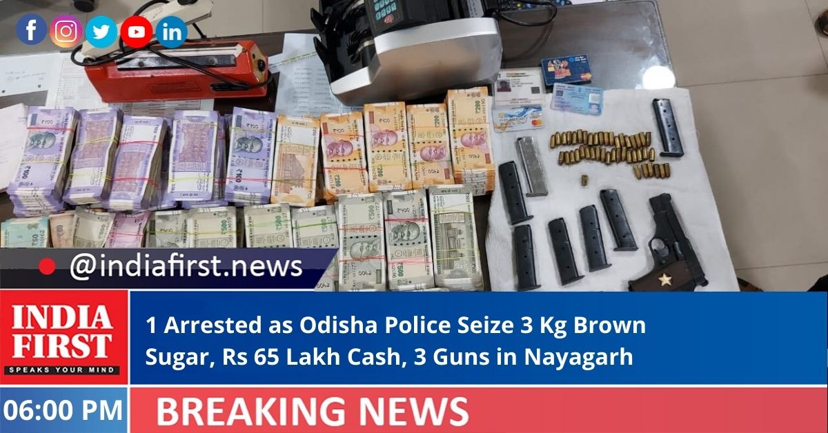 In a major drive against narcotic drugs, Odisha police have seized over 3.100 kg of brown sugar, cash over Rs 65 lakh and three guns from Nayagarh district and arrested one person.