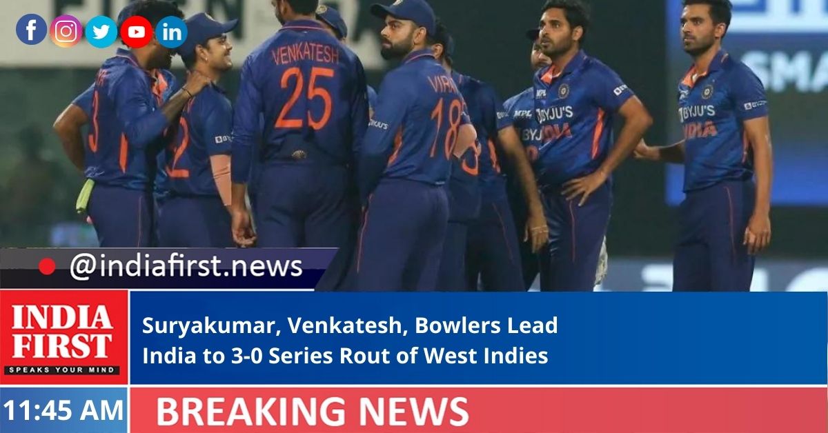 A classy fifty from Suryakumar Yadav (65 off 31) and an aggressive knock by Venkatesh Iyer (35 off 19) followed by a clinical bowling effort helped India beat West Indies by 17 runs in the 3rd T20I and complete a 3-0 clean sweep of the three-match series, at the Eden Gardens, in Kolkata yesterday.