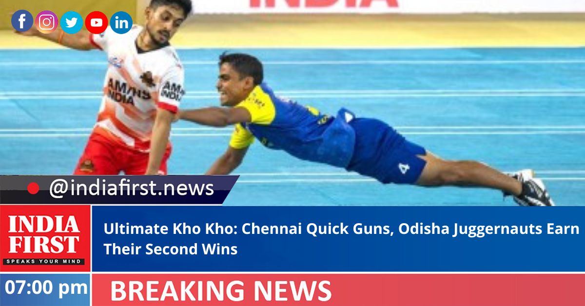 Chennai Quick Guns and Odisha Juggernauts notched up their second victories in the inaugural edition of Ultimate Kho Kho by thrashing Mumbai Khiladis and Rajasthan Warriors respectively at the Shree Shiv Chhatrapati Sports Complex, here on Friday.