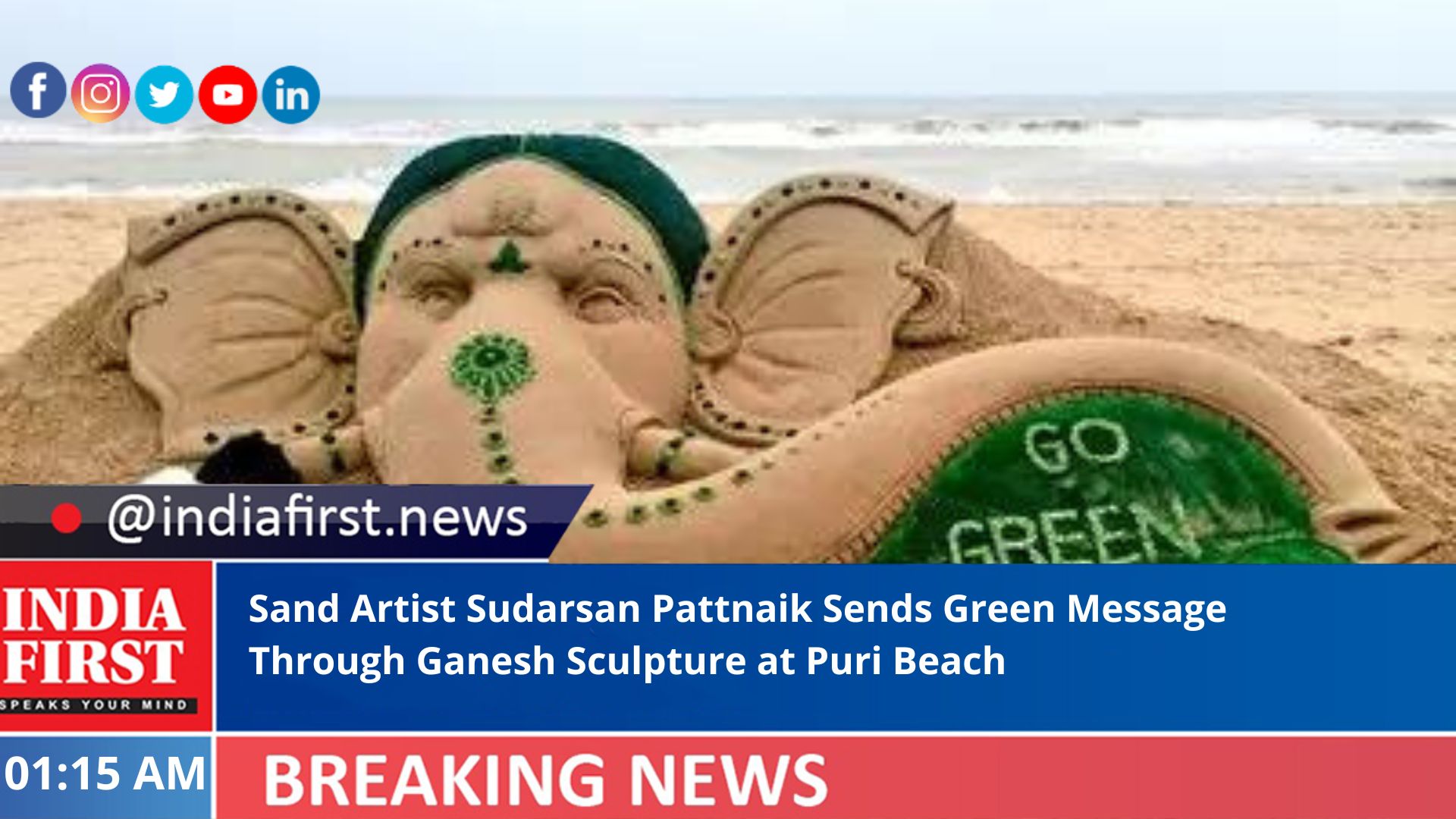 Sudarsan has created a six-feet-high sand sculpture of Lord Ganesh by using the sand ladoos with two elephants, and with a message “Happy Ganesh Puja”. He shows two elephants in his sculpture praying for the environment.
