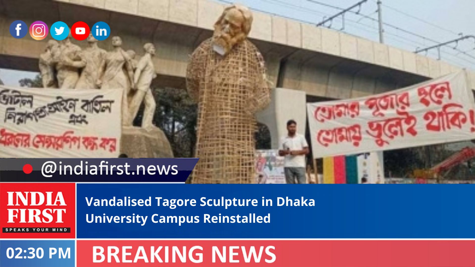 Bangladesh Students Union Dhaka University unit President Shimul Kumbhkaar said: “We have reinstalled the vandalised sculpture. It is a protest against repression and censorship. We have also placed two banners.”